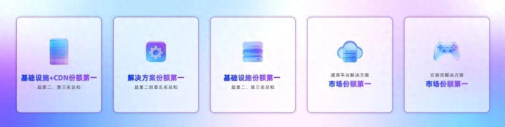阿里云在这份讲明里,以皆备上风拿下了 5 个第一:基础设施+CDN 份额第一、处置决议份额第一 、基础设施份额第一、 通用平台处置决议份额第一、云游戏处置决议份额第一。其中基础设施+CDN 份额、基础设施份额都超第二、第三名总数,处置决议份额更所以 42% 份额超第二到第五名总数。更贵重的是,以上统计口径均为营业化市集数据,不计入里面用量。