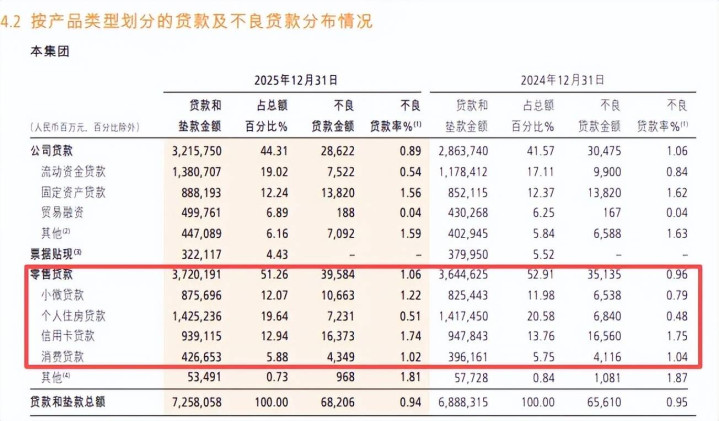信用卡贷款、小微贷款、个东谈主住房贷款、奢靡贷款不良贷款分辩为163.73亿元、106.63亿元、72.31亿元、43.49亿元,同比分辩变动-1.87亿元、41.25亿元、3.91亿元、2.33亿元。