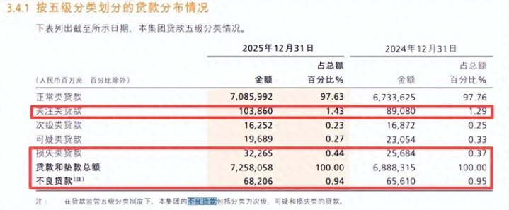不良贷款稳增,暖热类贷款大增近148亿元。2021年至2025年,招商银行不良贷款稳步上涨,分辩为508.62亿元、580.04亿元、615.79亿元、656.1亿元、682.06亿元,不良贷款率呈现先涨后降态势,分辩为0.91%、0.96%、0.95%、0.95%、0.94%,总体保抓在低位。