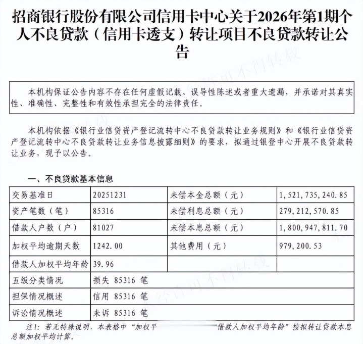 3月,招商银行信用卡中心泄露2026年第1期个东谈主不良贷款(信用卡透支)转让神志不良贷款转让公告,未偿本息总和18.01亿元,借债东谈主觉得81027户,财富笔数85316笔,沿途为亏损类。