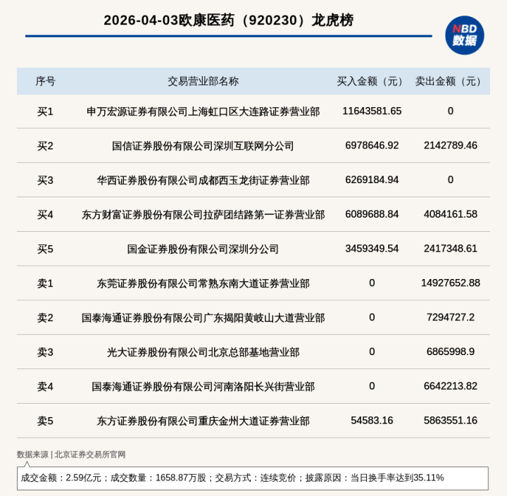 每经讯,2026年4月3日,北交所上市公司欧康医药(920230,收盘价:14.45元)登上龙虎榜,开元棋牌来去面貌是衔接竞价,开云体育官网线路原因是当日换手率达到35.11%,成交数目1658.87万股,成交金额2.59亿元。买一席位为申万宏源证券有限公司上海虹口区大连路证券生意部,买入1164.36万元;卖一席位为东莞证券股份有限公司常熟东南大路证券生意部,卖出1492.77万元。
