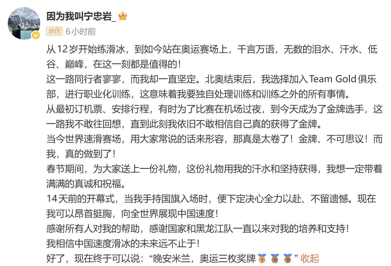 在冲破奥运记载夺得冬奥会速率溜冰须眉1500米冠军后,中国选手宁忠岩发布微博: