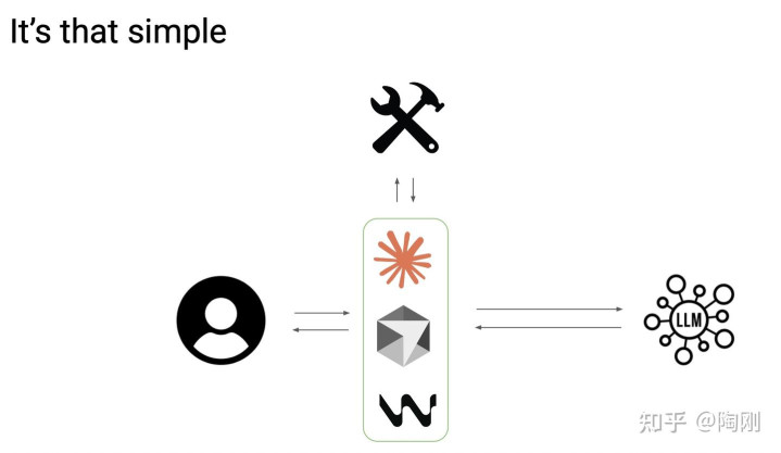 就这样一张图。用户和Agent交互,Agent和LLM交互,LLM在需要的时期告诉Agent调用什么用具,Agent推行完把成果复返给LLM,LLM再继续激动任务。