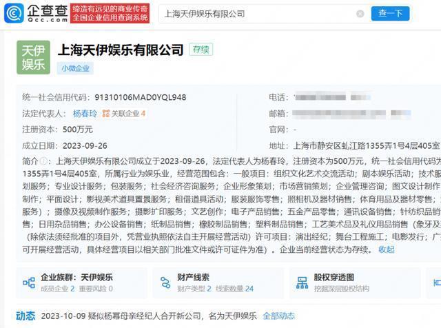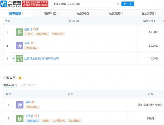4月9日,郑合惠子签约杨幂新公司酌量话题登上热搜,网传签约主体为上海天伊文娱有限公司。 企查查APP成见,上海天伊文娱有限公司成立于2023年9月,该公司注册老本为500万元,开云体育宗旨规模包含组织文化艺术疏导活动、脚本文娱活动、上演经纪、电影刊行等,由杨春玲、诗摇、共青城尘星及月投资有限公司共同握股开云体育,杨春玲为该公司推行遗弃东谈主、总司理及法定代表东谈主。值得顾惜的是,杨幂并未在该公司任职或握股。 裁剪/胡克青